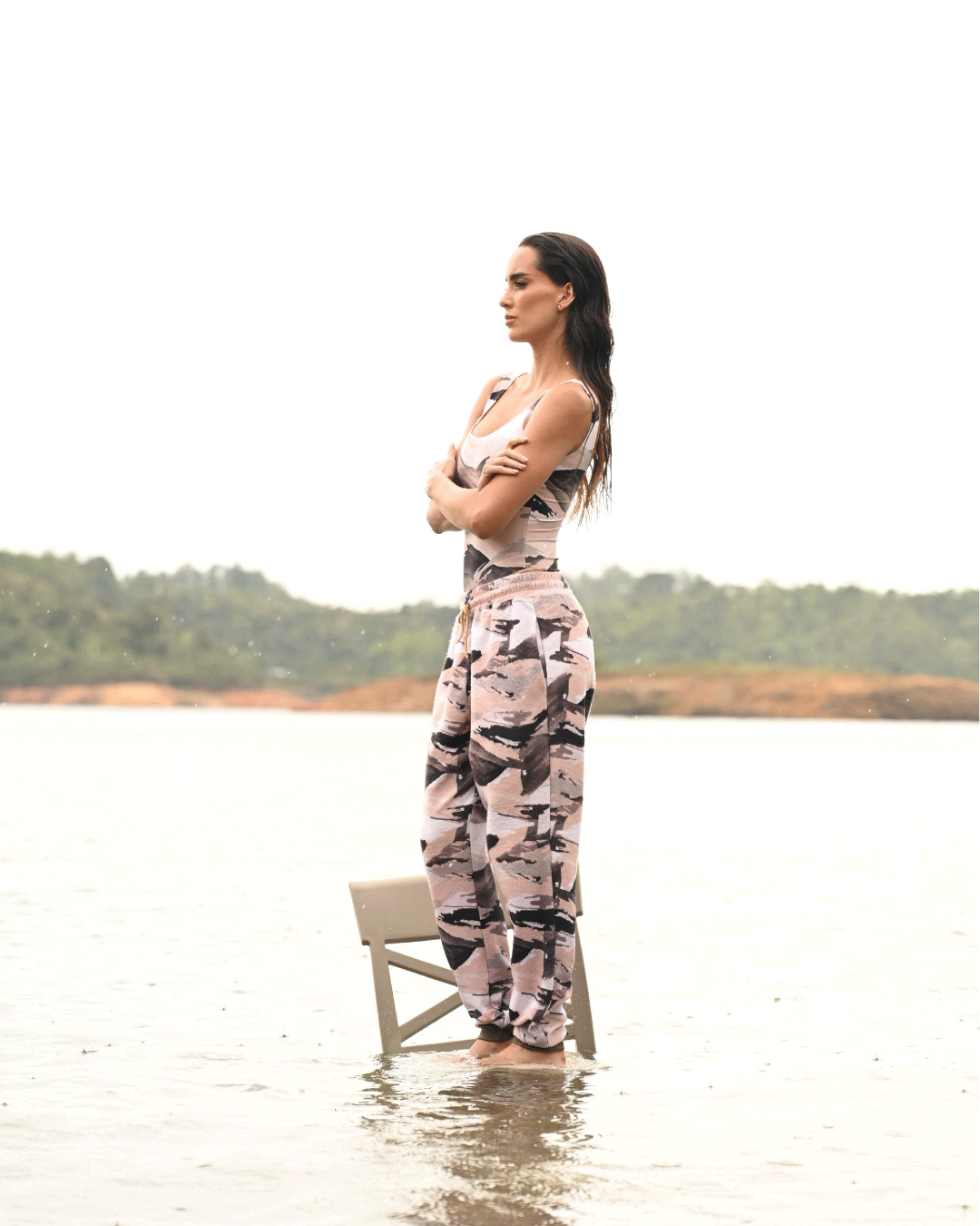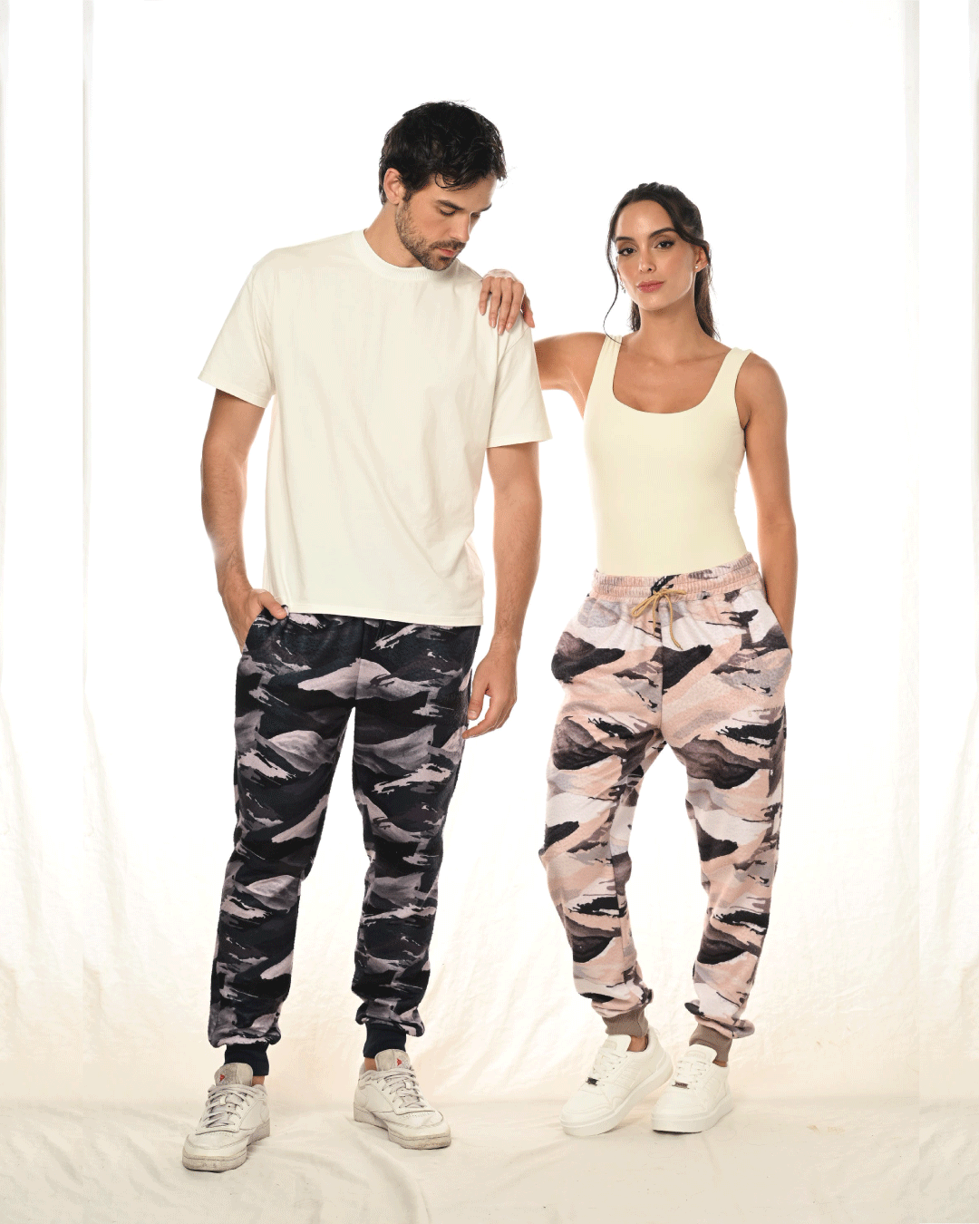 Elaborado en burda perchada premium, sublimado con un print auténtico inspirado en la fluidez de los azules nocturnos del desierto, cuenta con bolsillos funcionales y una pretina elástica con cordón ajustable para un ajuste ideal. Su diseño incorpora el logo de la marca en alto relieve y una placa bañada en plata