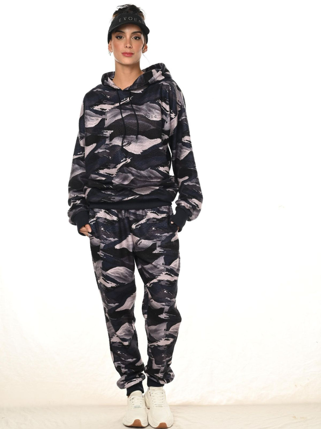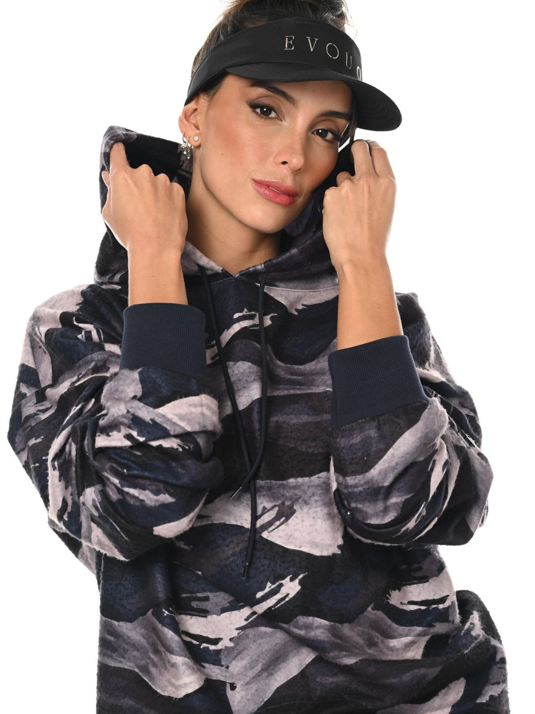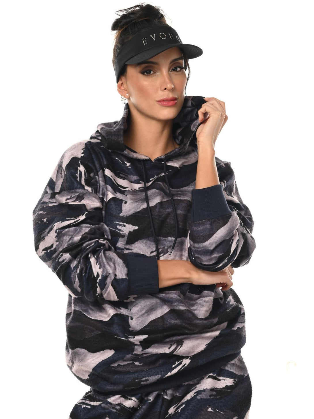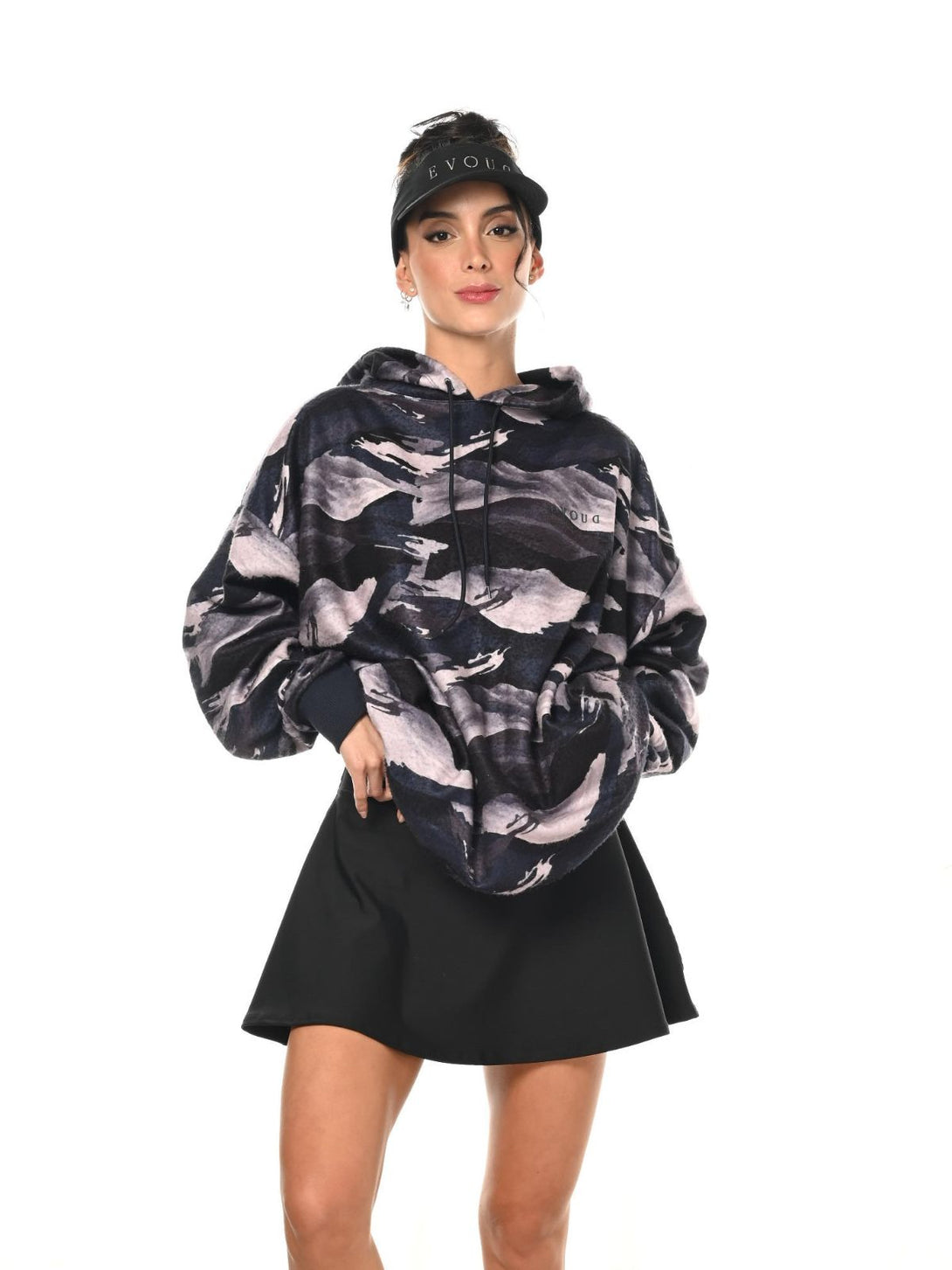 Confeccionado en burda perchada premium, su diseño sublimado con un print auténtico inspirado en la fluidez de los azules nocturnos del desierto, incluye bolsillos laterales y capucha con cordón ajustable para mayor funcionalidad y ajuste. El logo en alto relieve y la placa bañada en plata añaden un toque de lujo que eleva su estilo sin esfuerzo.